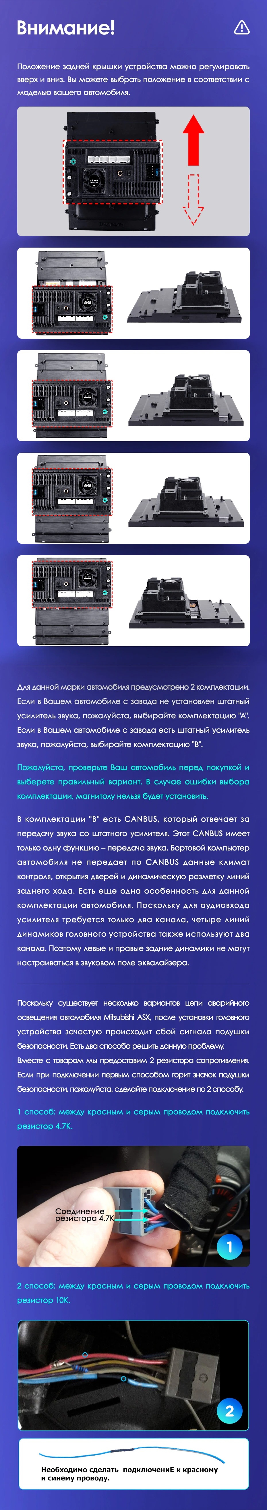Установочный комплект для Mitsubishi ASX 1 2010-2016 включает переходную рамку и проводку.
